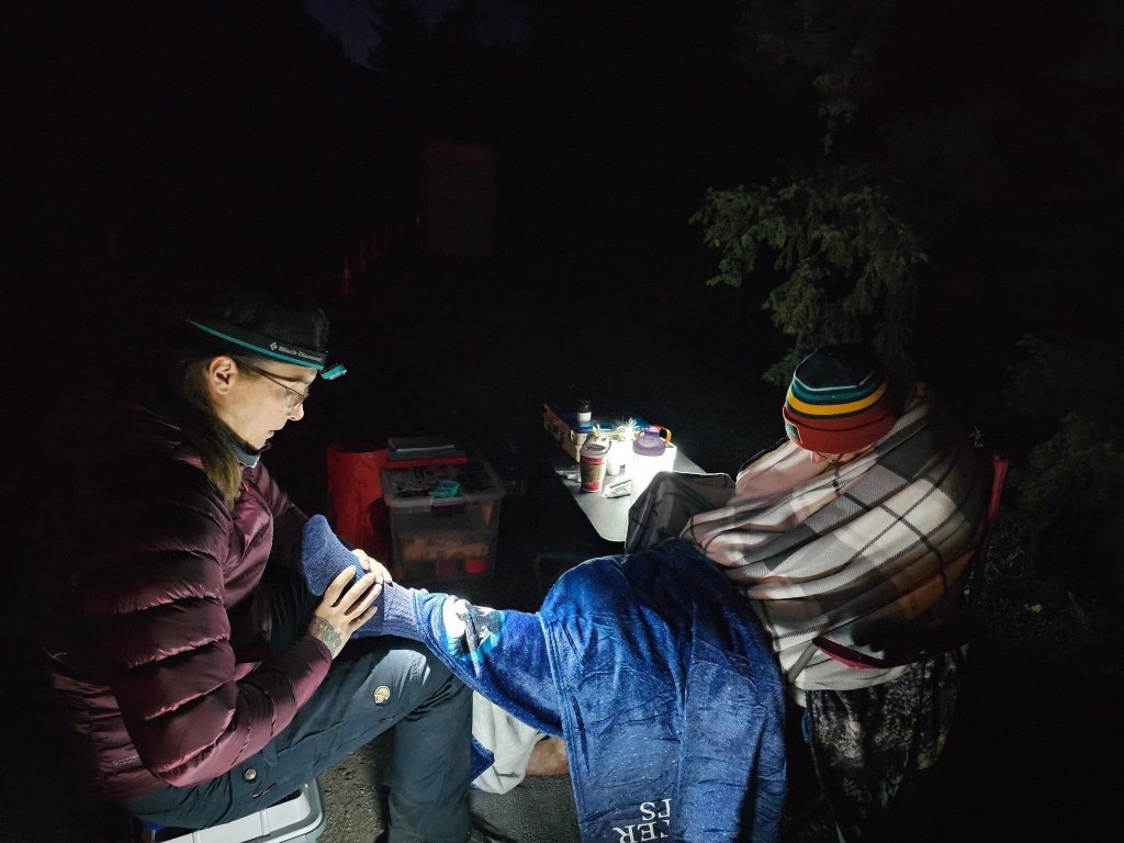 Checkpoint 3 is the first time racers have a chance to see their crew, and after 69 kilometers and some 4100 plus meters of climbing, it is a welcome sight. Many things were indeed put to right in Checkpoint 3, where Brenda quickly took control, wrapping me in the “burrito blanket” which was to become something of a signature look for me in the race.