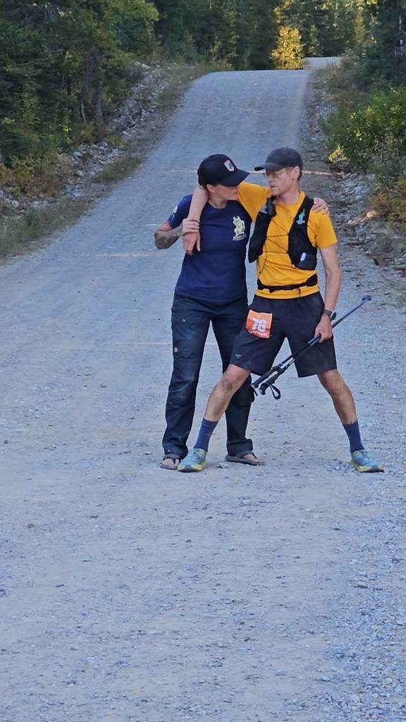 As we caught up to her, there were just a few kilometers left, and now Lawrence urged us both onward. The last mile was pretty much all out–our miracle mile, Selina called it later. Cresting the final hill, we could at last hear the cheers–real cheers, not the hallucinatory ones I heard earlier, that turned out to be the wind sighing through the trees. Brenda was standing in the middle of the road, and others were coming out of the checkpoint to watch. When I reached her, my legs buckled, and she helped me towards the chair and aid stations. I was well and truly done.