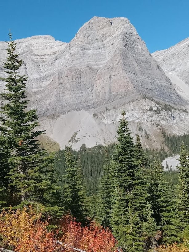 Nonetheless, I feel fortunate to have been just slow enough to experience this stretch in the daytime rather than at night. The mountain itself is stunning. The glacier-carved lake was a dreamy turquoise, and all up the side of the scree slope there was a trail winding through multi-coloured underbrush, reddish-purple Spiraaea and red-twig dogwood. Above us loomed the great amphitheatre of Window Mountain, so named because of a limestone arch, or window, near the summit.